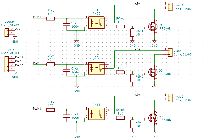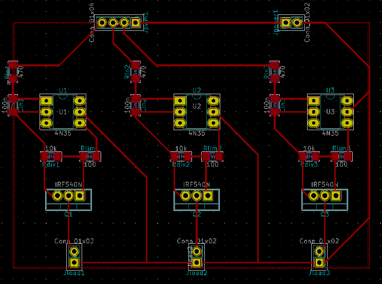 I need 4 power terminals: one per channel plus one for the alim. Concerning the optocouplers, several versions exist, with 4 channels or 4*1 channel. The second solution is used here. Concerning the power MOSFETs, the chosen IRF520 includes a protection diode.