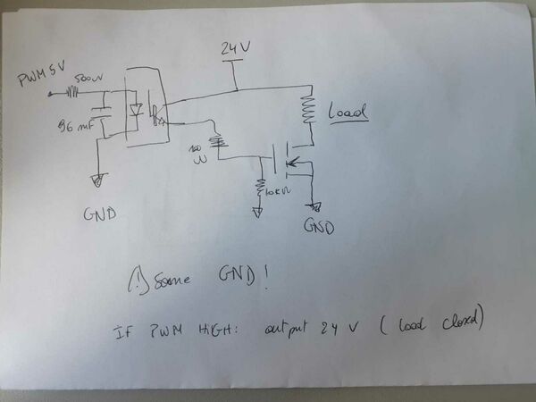 The principle is the following: the input is the logical (0/5V) PWM signal generated by the satshakit. The optocoupler will isolate it from the power. At the output of the optocoupler, the voltage is already 24V, but the current that an flow through the optocoupler is too small to power the valve. The output of the optocoupler is then used to drive the MOSFET (that can be seen as a current switch controlled in 24V). If the MOSFET is “open”, the load will be connected to the ground and current will flow trough the load and the MOSFET, otherwise not.