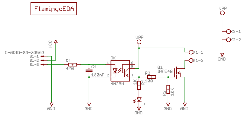 The main difference in my case are that I remove the LED and its current limiting resistor, and that I use an IRF520 as MOSFET. The final schematics and details used for my project will be detailed on the Final project pages. Here is my schematic: