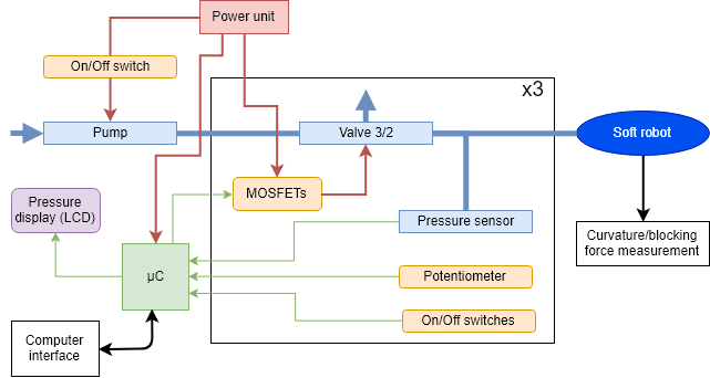 The blue parts are related to the pressure, and the yellow ones to the interface. The microcontroller would be connected to a computer to control the board using an user interface. The pressure value display is optional here (it would allow standalone operation, i.e. without connection to a computer).