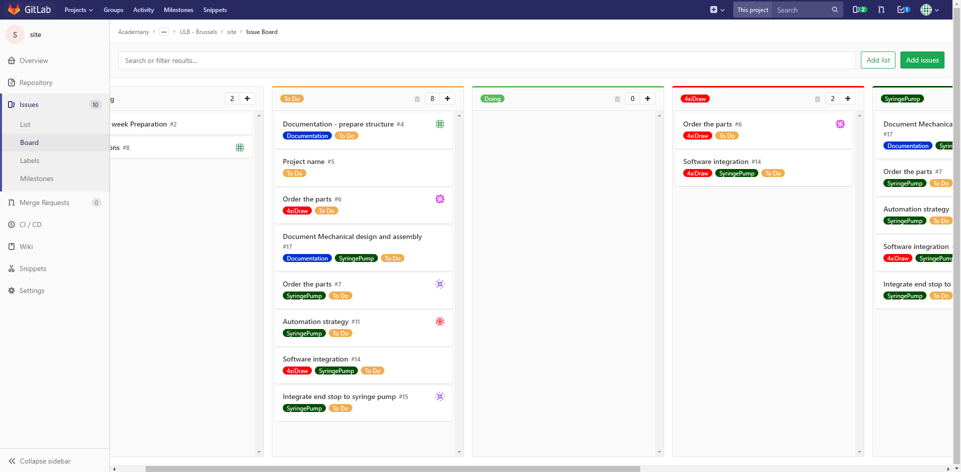 The first part of this week’s job was to plan the work! We already decided that we would adapt the 4xiDraw machine for sherification (this is documented on the group pagepage). We are 5 doing the fab academy, and 4 instructors, the first task was to plan and separate the work! After a little bit of whiteboard brainstorming, we agreed to share the work with our strength: a group working on the 4xiDraw, and the other one on the syringe pump. Concerning the repartition of the tasks, we used the issue tracker of gitlab, a great tool for project management! Each task is an issue, and they can be visualized multiple ways: including my favourite: trello-style: