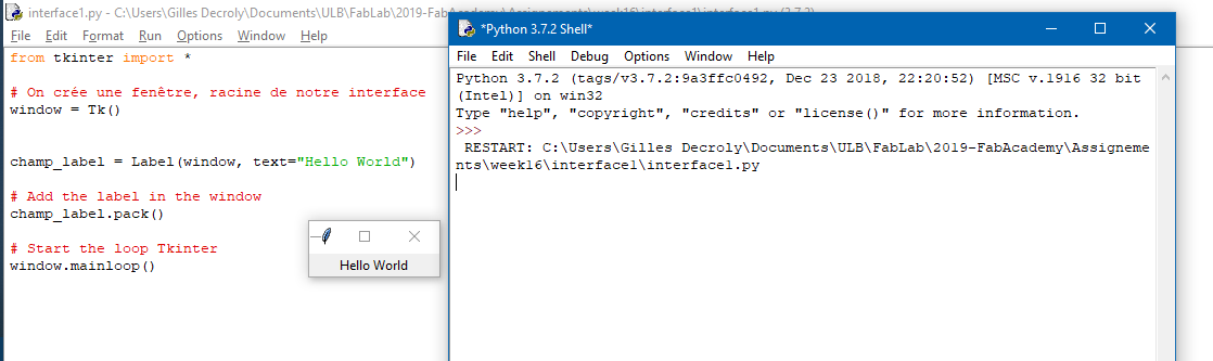 First thing: the Tkinter Hello world. I followed this french tutorial