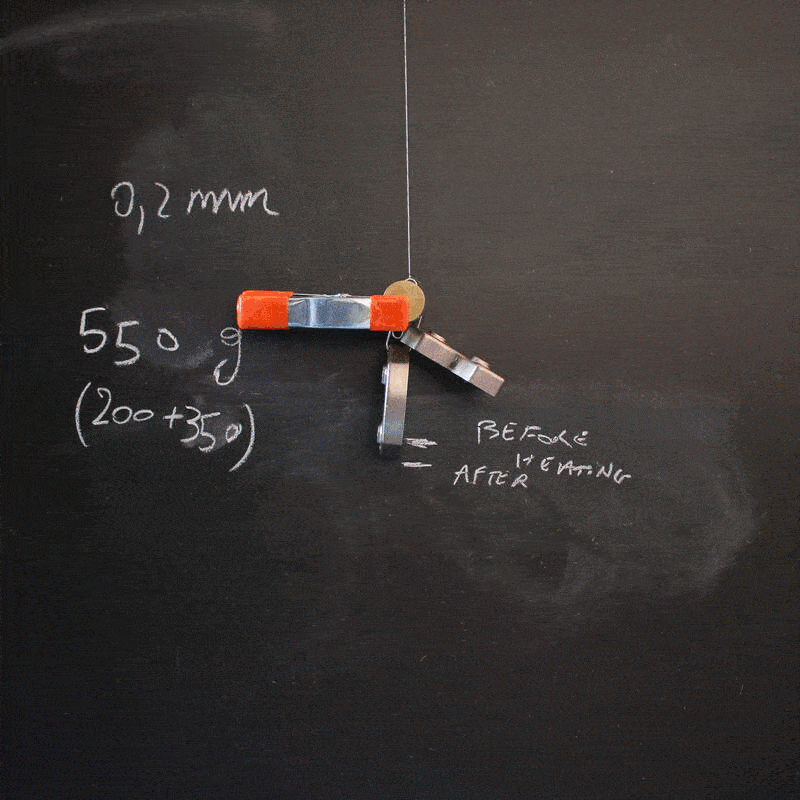 We made some tests to with the fabricated threads. The results were not as impressive as in the papers, but we were able to obtain a contraction of the thread. We suppose that it could be improve by controlling better other parameter (weight, actuation temperature, coil ratio, type of nylon, …). Here is an example of results with a 0.2 mm diameter thread: