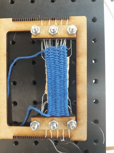 With the working twisted thread, we want to make a small “smart fabric”. To do this, we first made a mini loom frame weaving, found and nicely documented on instructables. And making the fabric: