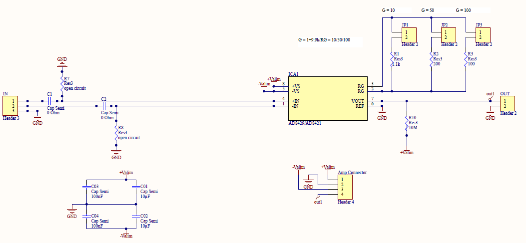 As explained above, I need to amplify the signal. Since the output of the pressure sensor is differential, I will use an instrumentation amplifier. Hugo, one of my colleague, already designed boards. It uses this amplifier. So I will adapt it for my needs. Here is his schematic (different gain are prepared, that can be changed using a jumper):