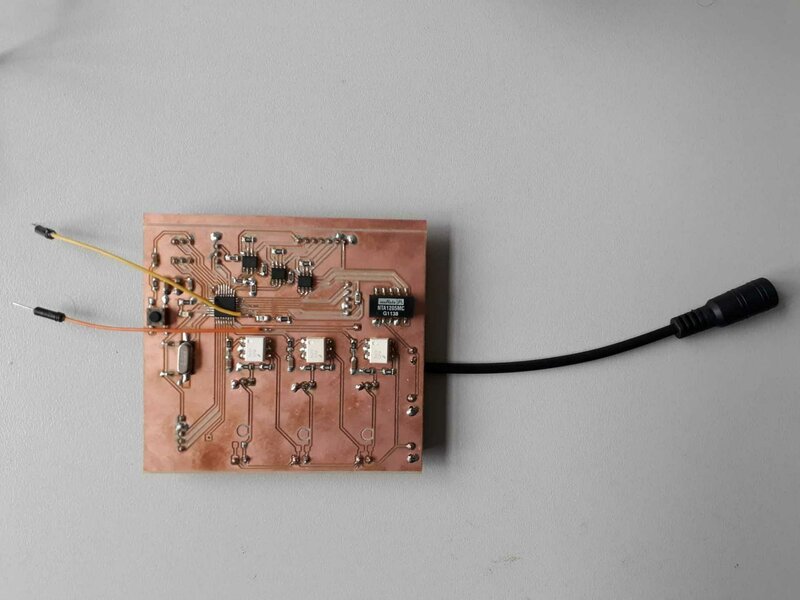Last but not least, the pcb must be programmed. I used the same protocol than in week 14, to use it as an Arduino. It is basically just what was done in week 11 for the inputs, week 12 for the outputs, and week 14 for the communication with the interface, gathered in one code. The code itself can be downloaded from the top of the page.