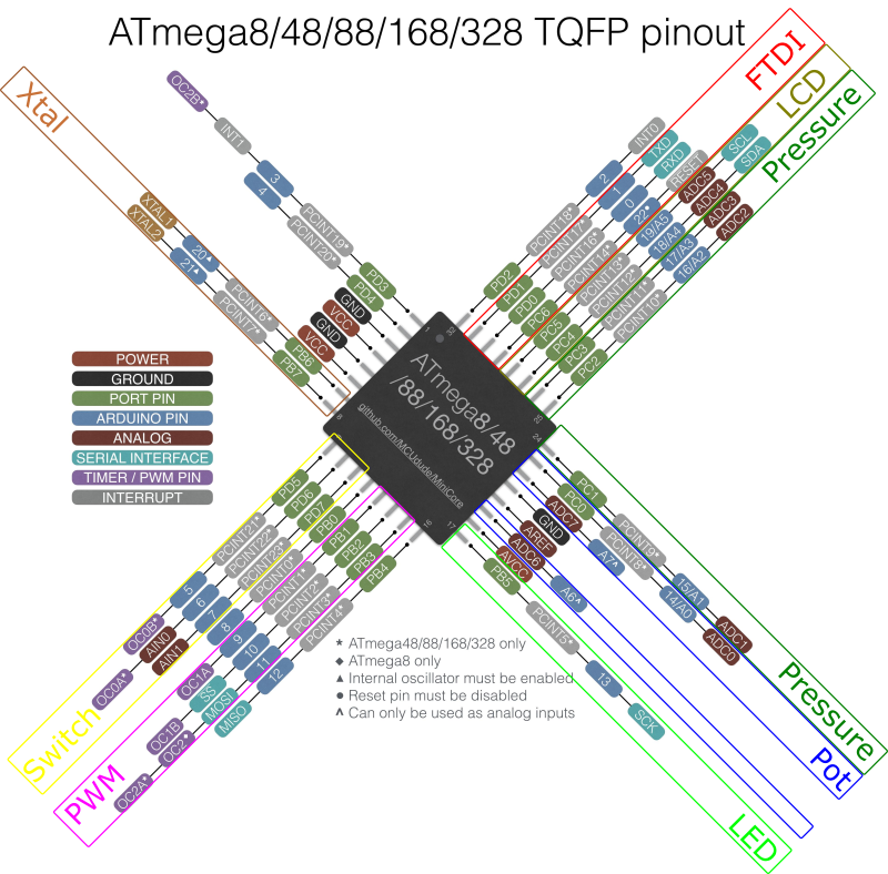 I am ready to put all my boards and components together and test the assembly! First, let’s clarify how I’ll use the pins of the ATMega328P.