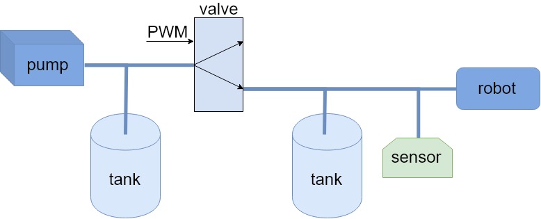 But, I have another problem: with the tested pneumatic circuit, there is a lot of noise on the pressure signal! The pressure oscillates quickly, at 30Hz, and of a non-negligible amount! First solution tested: increasing the PWM. To do this, I first made some bitbang test, following the simple example here. The results are not very encouraging: above 40Hz, the valves cannot switch anymore, there response time is too slow… The second (successful) solutions is to add inertia in the system, by adding “tanks”, large volumes (I used those kind of bottles, having a volume of 350 ml), in the pneumatic circuit. After testing multiple configurations, the following configuration works perfectly: