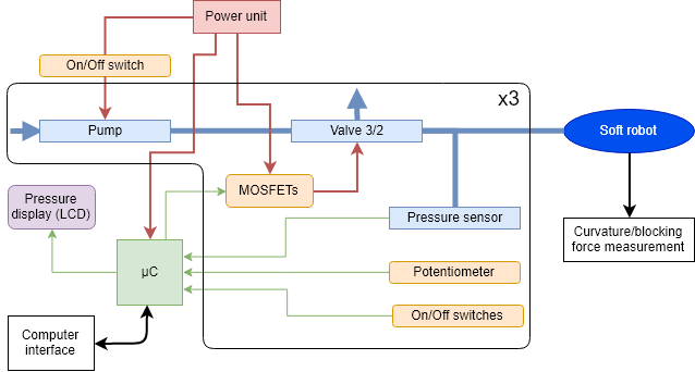 The blue parts are related to the pressure, and the yellow ones to the interface. The microcontroller would be connected to a computer to control the board using an user interface. The pressure value display is optional here (it would allow standalone operation, i.e. without connection to a computer).