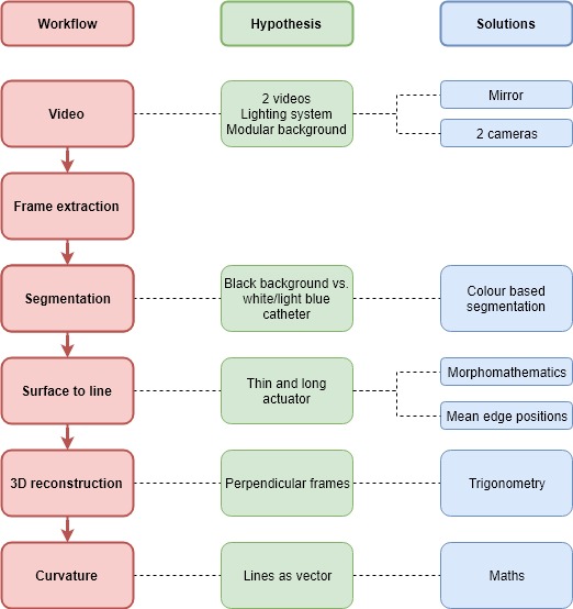 More than the control board, this week was dedicated to programming, and to extract the curvature radius from a test video of a catheter. Here is a schematic of the implemented workflow: