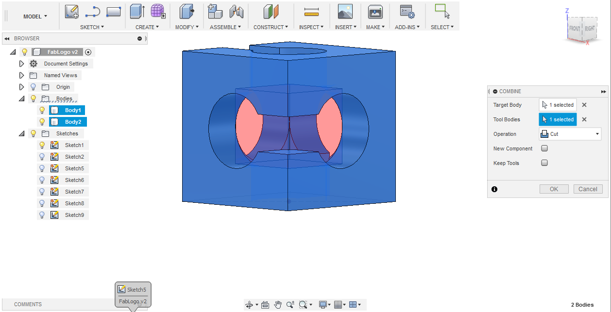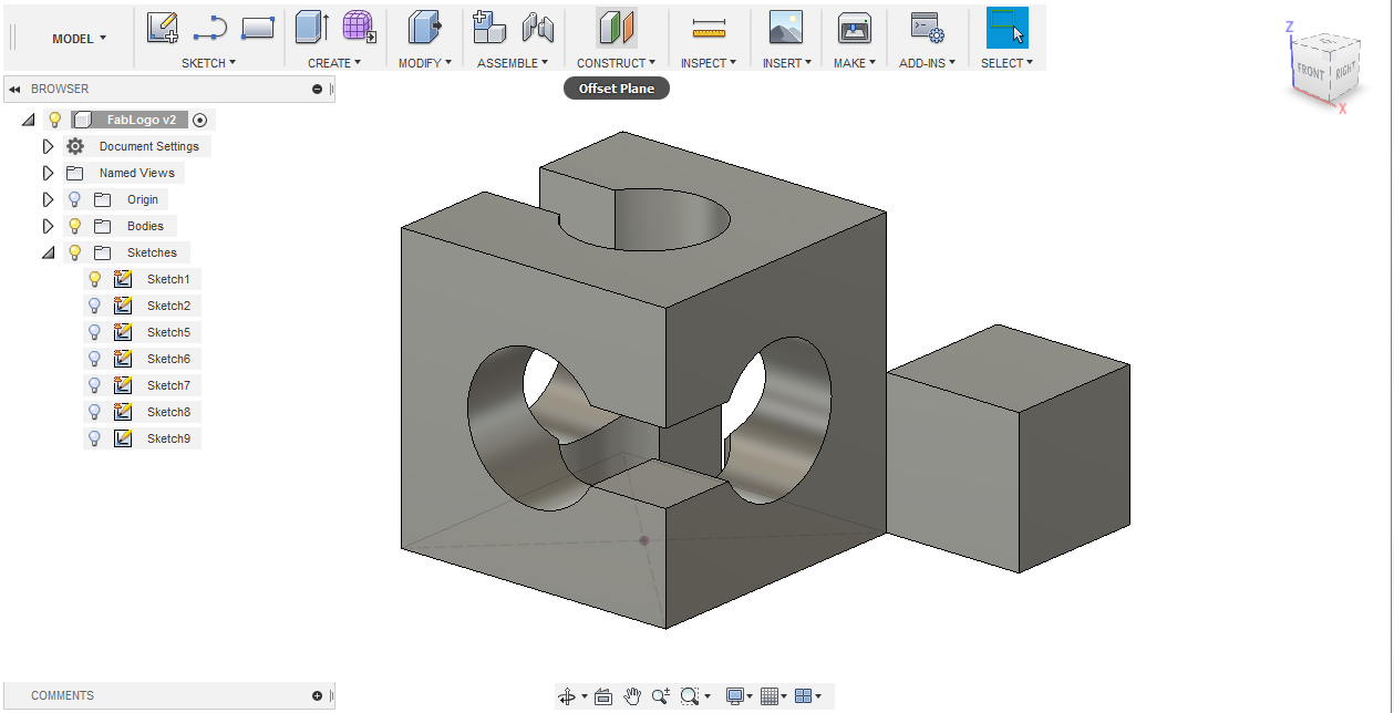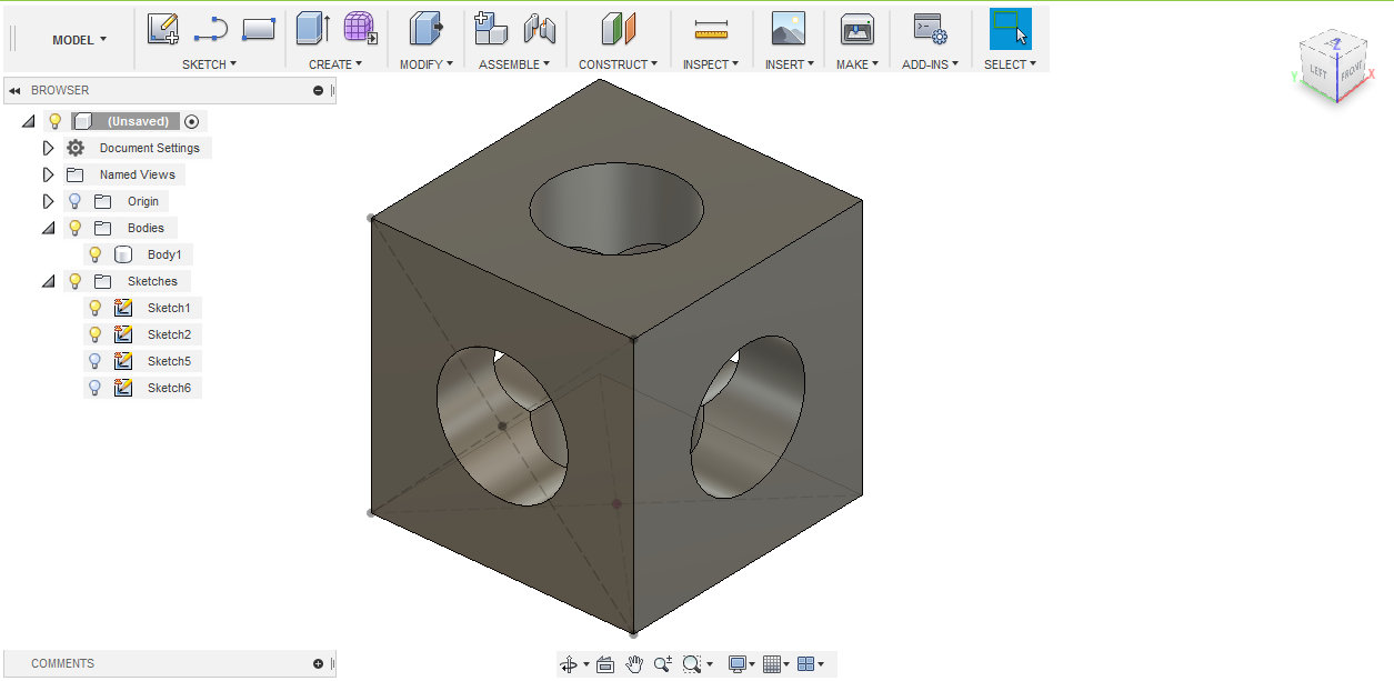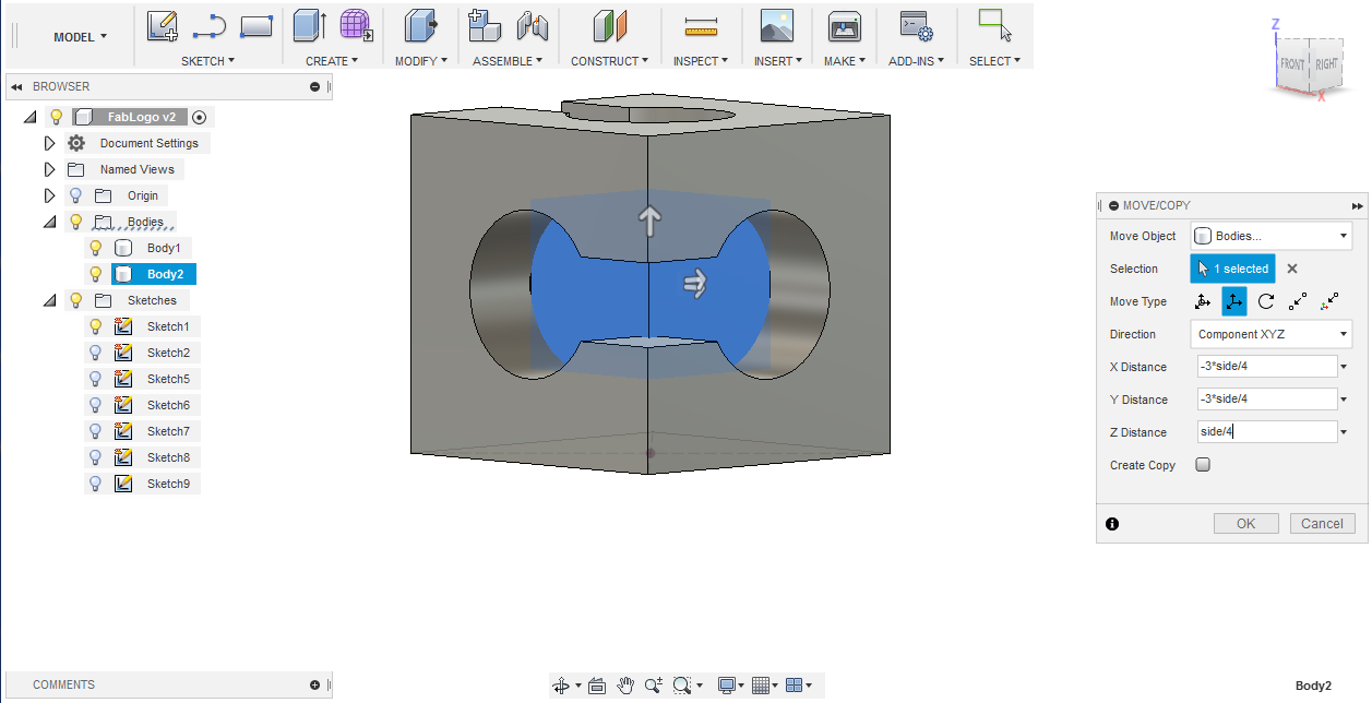 Finally, place a cube of side side/2 at the center of the body previously obtained and cut it from the latter. To do this, I place by constraint a cube outside the original body and translate it to the center of the latter.