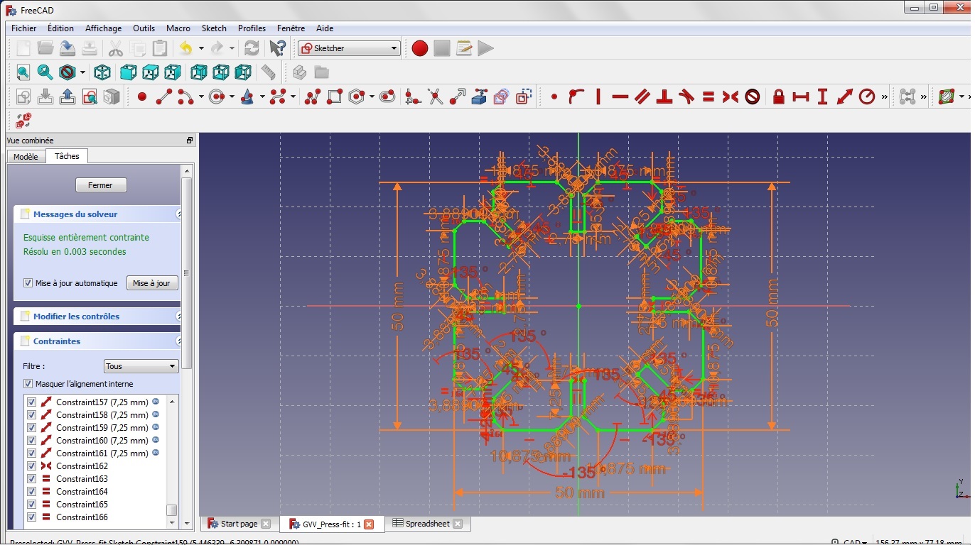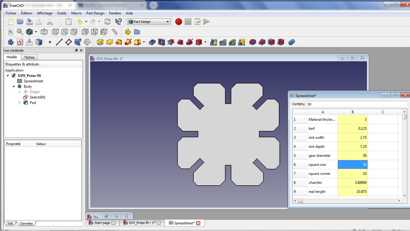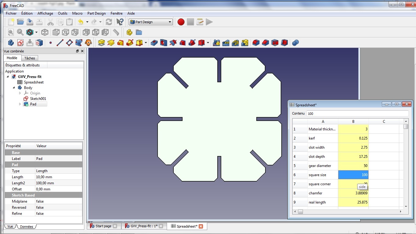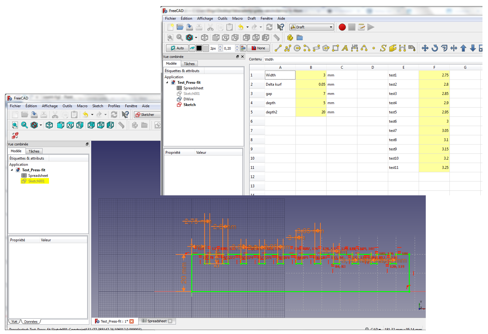 The objective here is to develop my own press-fit test. I work with FreeCAD, the software I learned last week, but this time, I try the parametric modelling, e.g., defining some parameters in a spreadsheet, and using these parameters as constraints for the sketch. The only independent parameters are the thickness of the material used, the kerf and the global size of my piece.