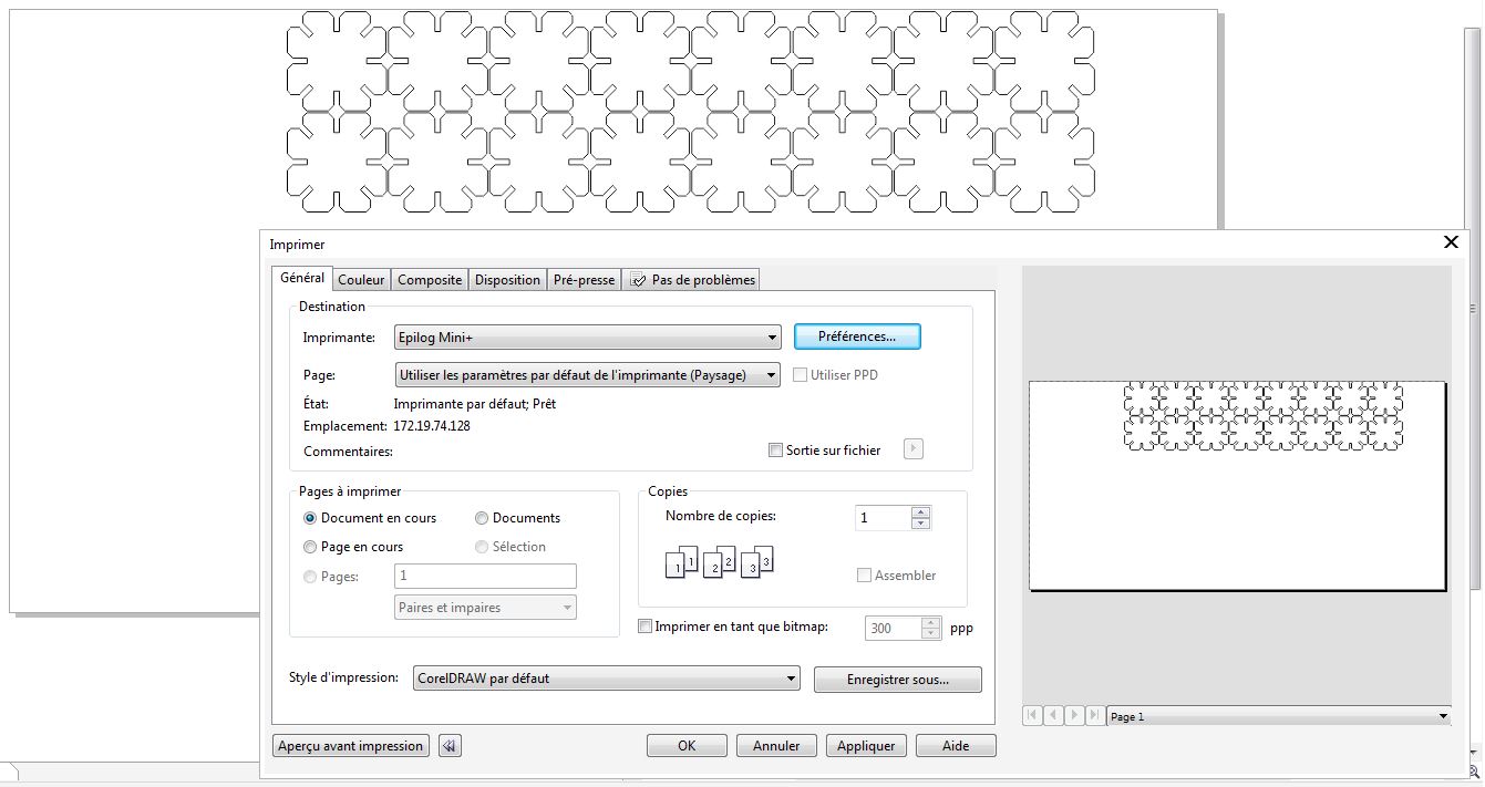 Place the MDF wood plate on the honeycomb support in the printer Caution: take care to start the design by defining the origin point through manual settings if needed ( On Epilog mini dashboard: set manually zero position (pointeur > x/y off > (move manually the laser pointer) > définir origine))