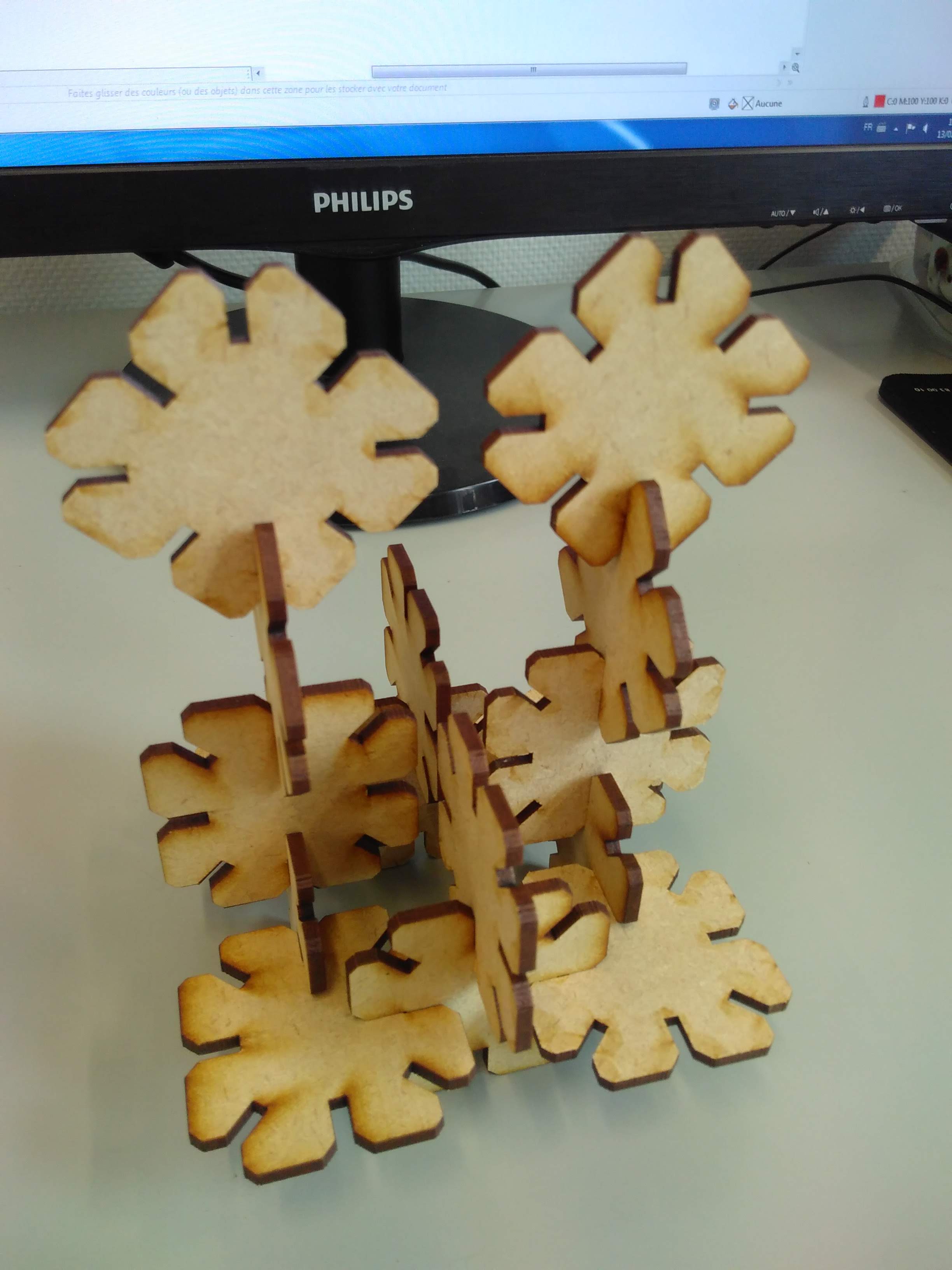 I helped Thierry to cut its shapes in 8mm thick plywood. Interesting point here is that given the non really flat plate (bought in a local DIY store), the parameters given for 9.5mm wood (speed 10, power 100) was not enough to properly cut the plate in some places.