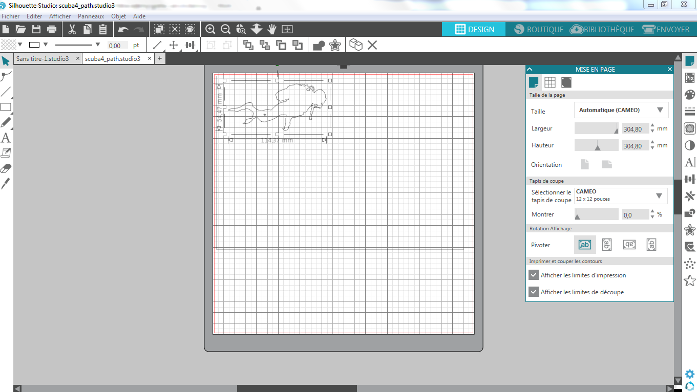 I’ll now try with my own drawing ( the scuba diver). First difficulty encountered is that the Silhouette Studio 4.1.9 requires vectorial drawing, but does not support SVG format!! So, back to Inkscape to transfer the drawing in DXF format!!