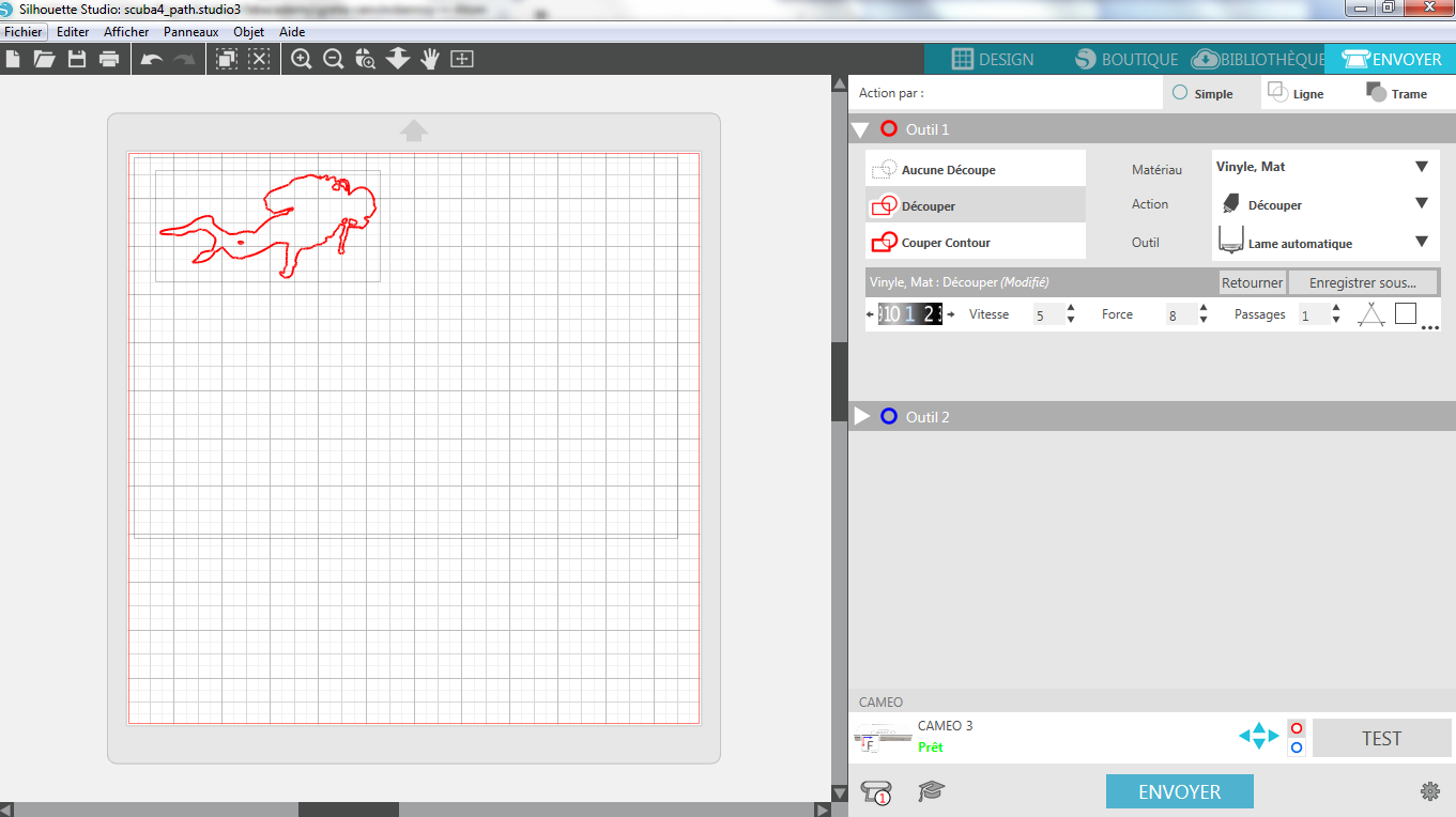 Choose the settings (SEND - ENVOYER tab): first choose material ( here vinyl mat), action (cut) and tool (silhouette lame, there is no other choice here)