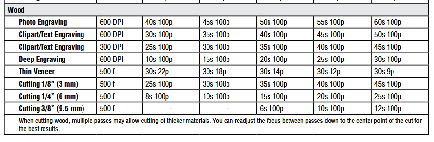 The standard settings for wood are given below (extract from EPILOG manual):