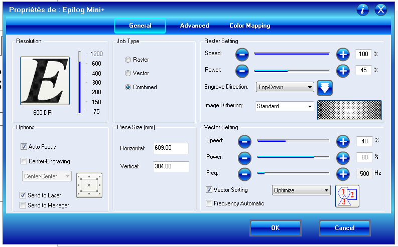 - When file is ready to be sent to printer, define the settings in the EPILOG driver in CorelDraw: