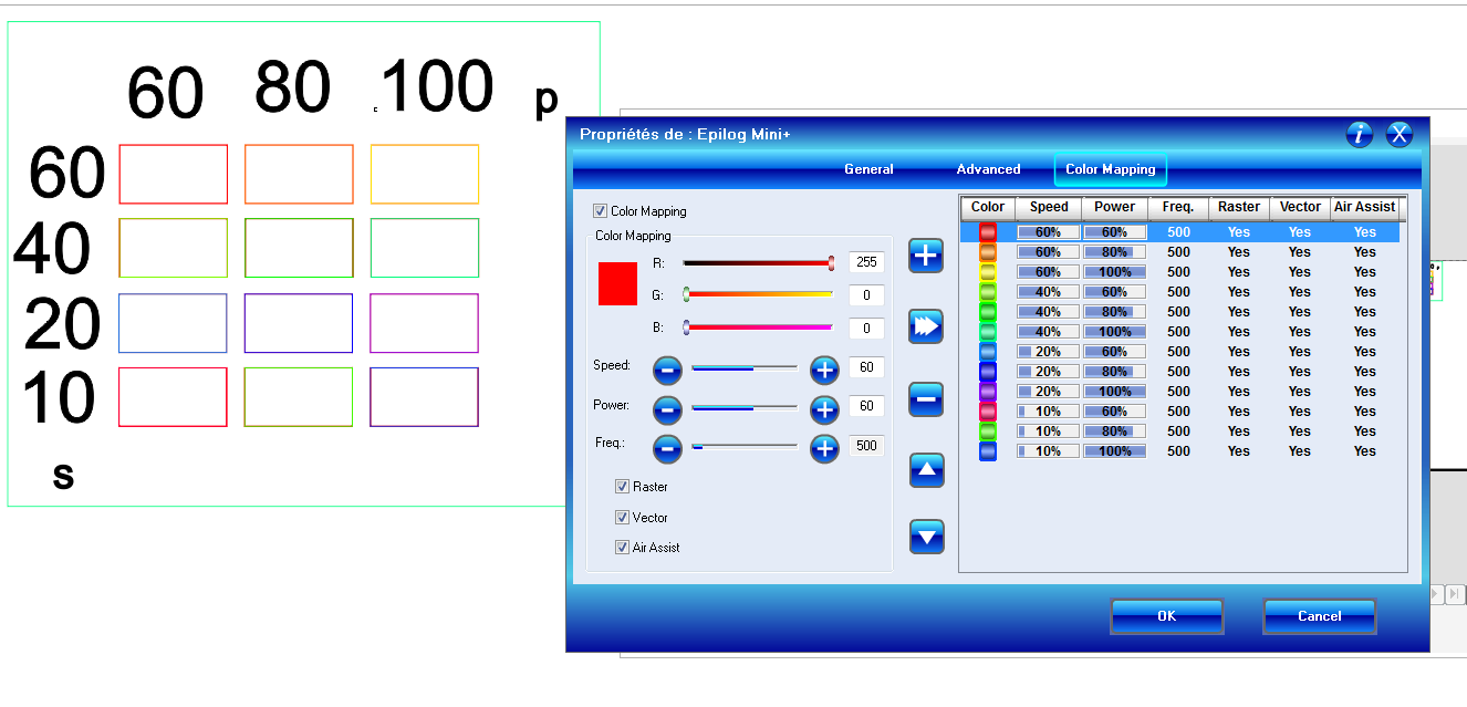 Power and speed parameters, using color mapping to cut rectangles at different settings values (Process 2)