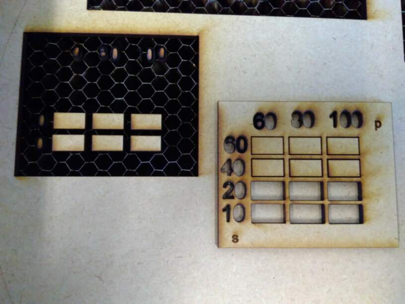 First test (top left): Power 80, speed 40 : comb is not completely cut (power too low)