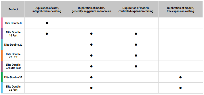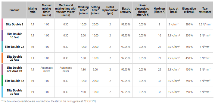 Looking at the datasheets of the several products available here, we see that the Elite Double range of silicone consists of several coloured products, final hardnesses (4) and setting times (3). Compatible with stones, polyurethane resins, acrylic resins and phosphate and alcohol-based investments (note: a dental casting investment is a material applied as a soft paste to a pattern that hardens to form a mold for casting)