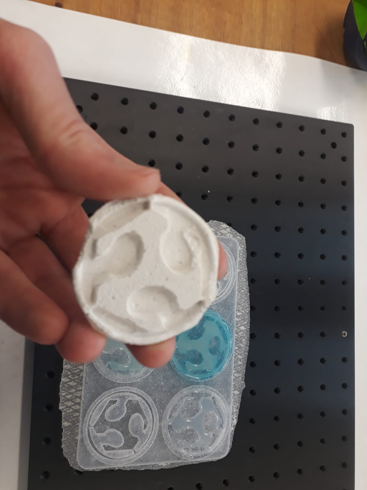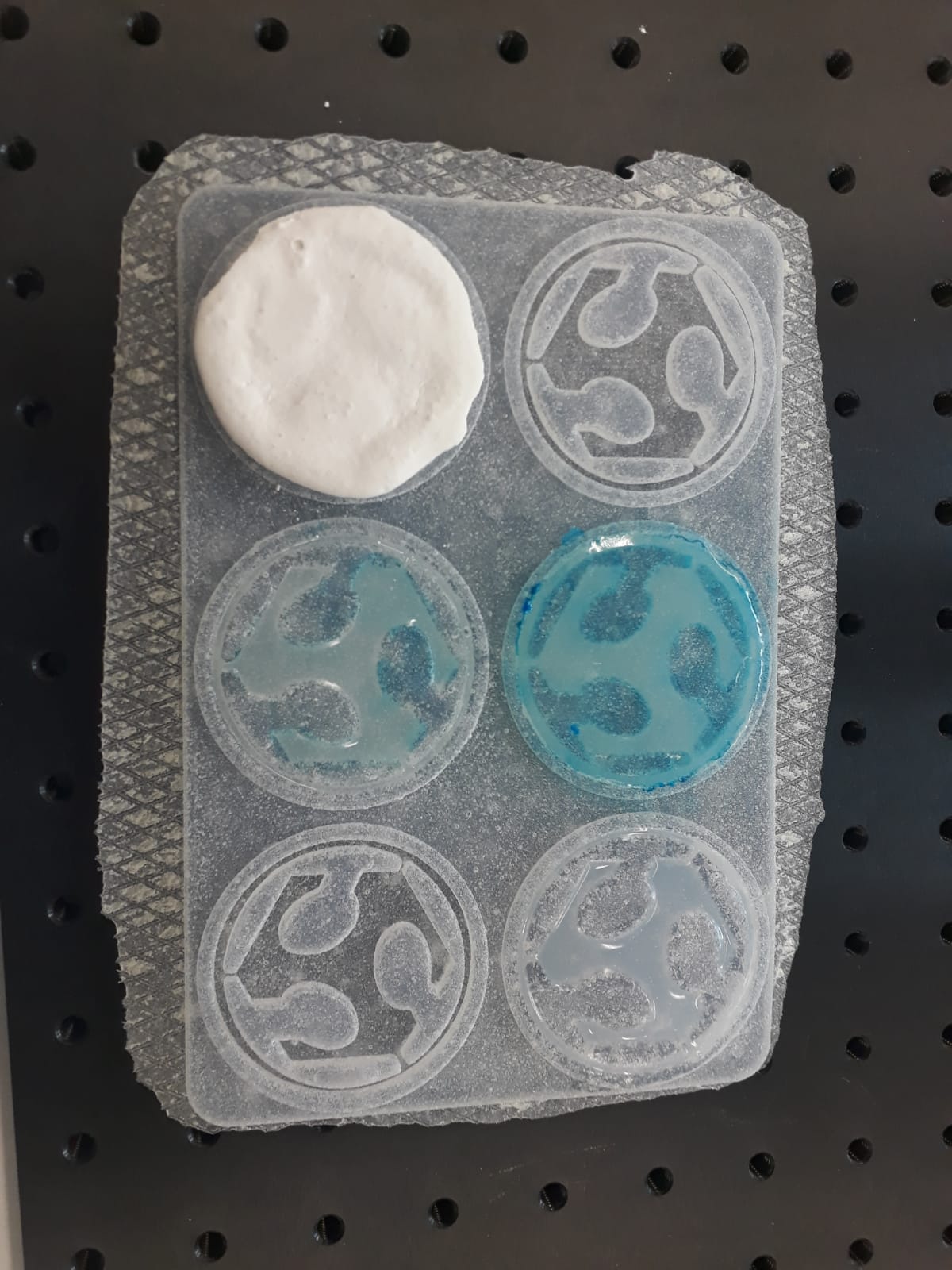 We made it the wild way, just to evaluate the results: no degassing of the epoxy, no release agent.... SuperSap CLV Bio-epoxy, is mixed by hand in a 100:40 ratio in volume with its hardener as explained in the materials choice section (http://fab.academany.org/2019/labs/ulb/students/greta-vanvinckenroy/assignments/week10/#supersap-clv-bio-epoxy), again with the adequate clothing to avoid incidents: gloves and lab suit…