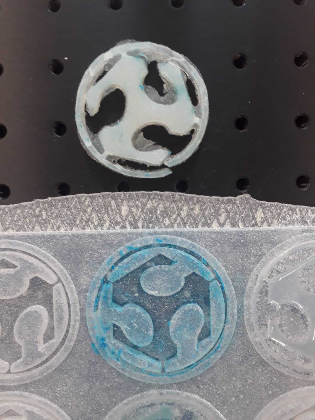 We made three tests, one using a demolding agent](https://www.easycomposites.co.uk/#!/wax-and-mould-release-agents/PVA-mould-release-agent.html) and the others without. We first tried to unmold the one with demolding agent, supposed to be easier. Indeed, the release agent helped, but this remained very difficult, seeing the adhesion between the two silicone!