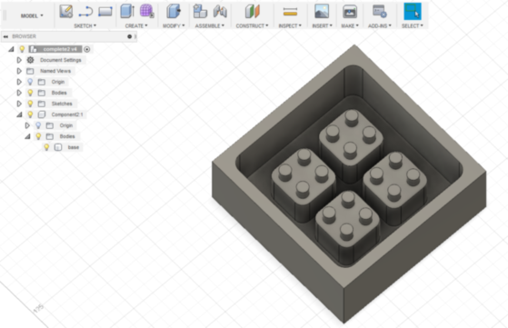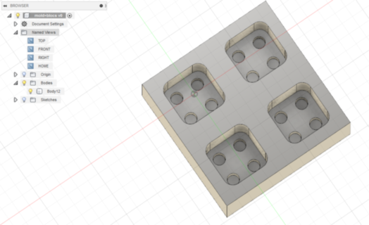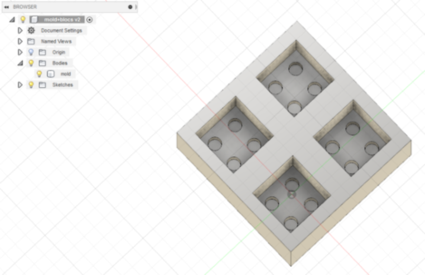 Concerning the shape to form, we opted for a simple structure, that we create with Fusion360 (on Windows7). The idea is to compare the behaviour of those materials, not to make a real mold yet. In order to test all materials at the same time, we decided to go for a unique mold with four cavities, in which we will pour the materials.
