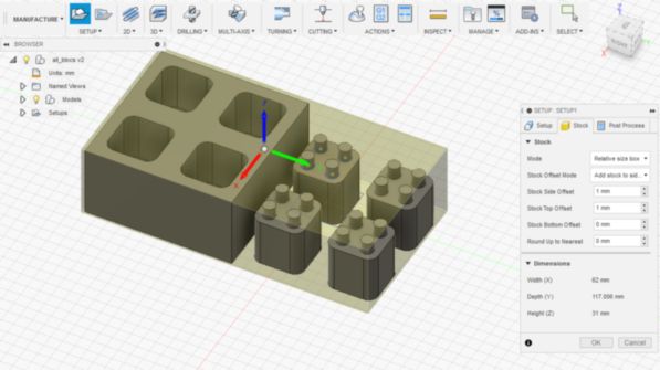 We then generate the toolpath and simulate the complete milling process through (ACTIONS → Simulate). Once the simulation is correct, we can duplicate the process for the four blocks, and run the complete simulation again for final check.