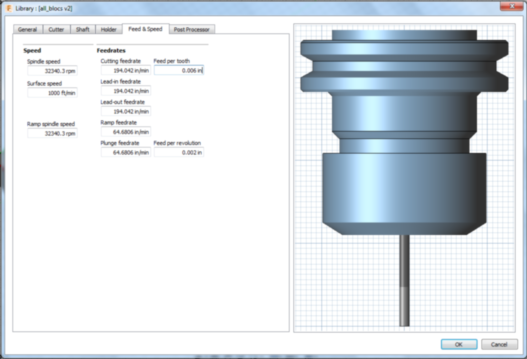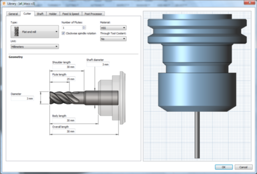 Let’s create a SETUP, choosing the correct tool, with the help of the Fablab Feeds and Speeds calculator: the physical data for the milling tool are measured (diameter, flute length, etc…) as shown below (tab cutter), and the feeds and speeds data are calculated in tab Feeds and Speeds.