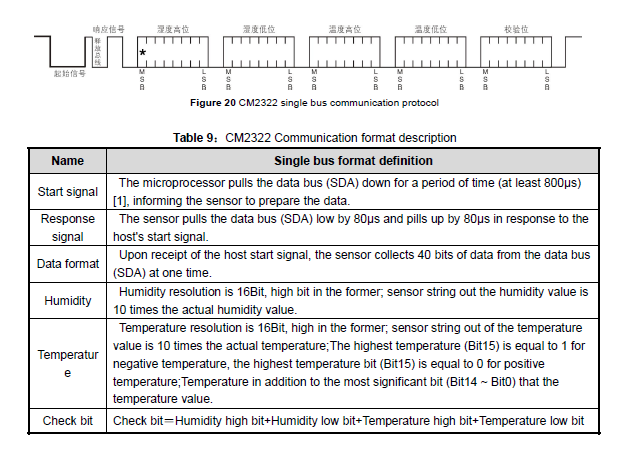 In 1-wire protocol, the CM2322 switches from Sleep to High Speed mode when the microcontroller host (MCU) sends a start signal (pulls the data bus SDA low by at least 800μs). After the host start signal is completed (line released for minimum 20μs), the CM2322 sends a response signal (pulls the data bus SDA low by at least 800μs))and sends 40Bit on the data bus SDA serially. The data sent is : the high byte of humidity, the low byte of humidity, the high byte of temperature, the low byte of temperature, the checksum byte. The sensor goes automatically into sleep mode after completion of the sending, until the next MCU request.