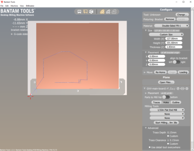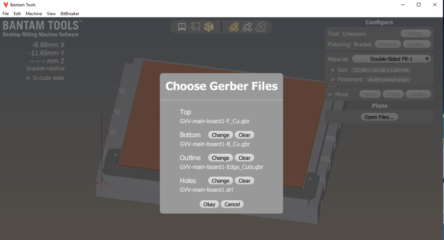 Therefore, I load the three gerber files of the outline, top and bottom layers, as created by Kicad, as well as the drill file, into the Bantam software.