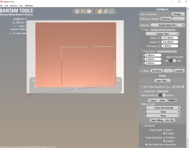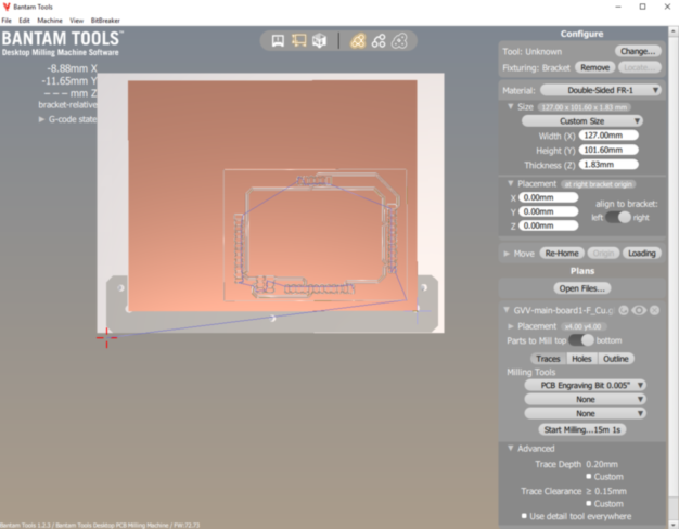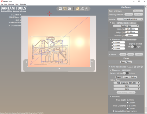 When the top layer is milled, I just flip the PCB on the Bantam plate, the software handles the mirroring of the gerber file automatically, provided the PCB is correctly aligned… Milling with the metal engraving bit 0.005” is a 15 minutes job.