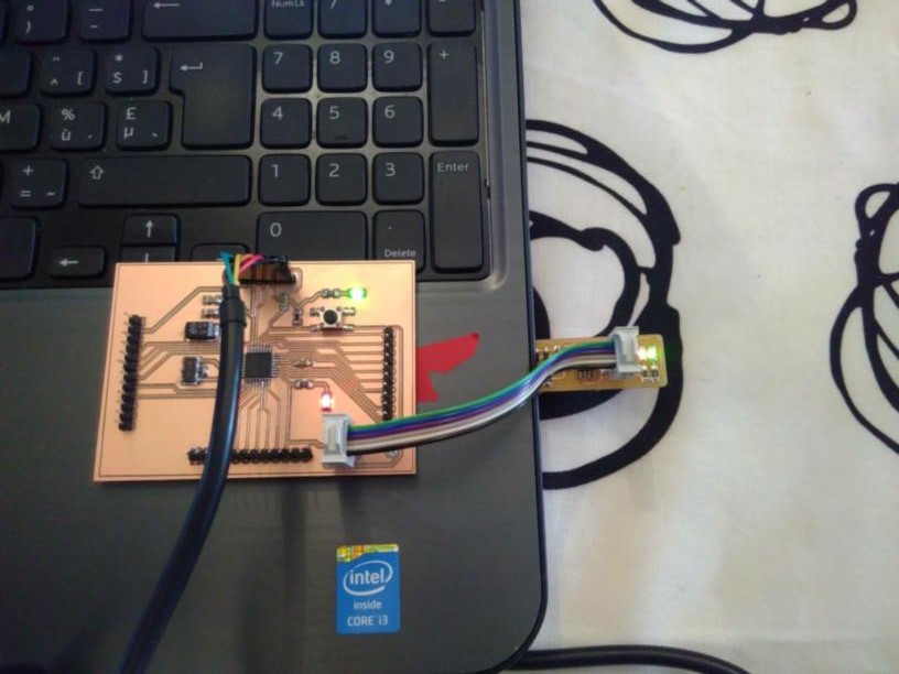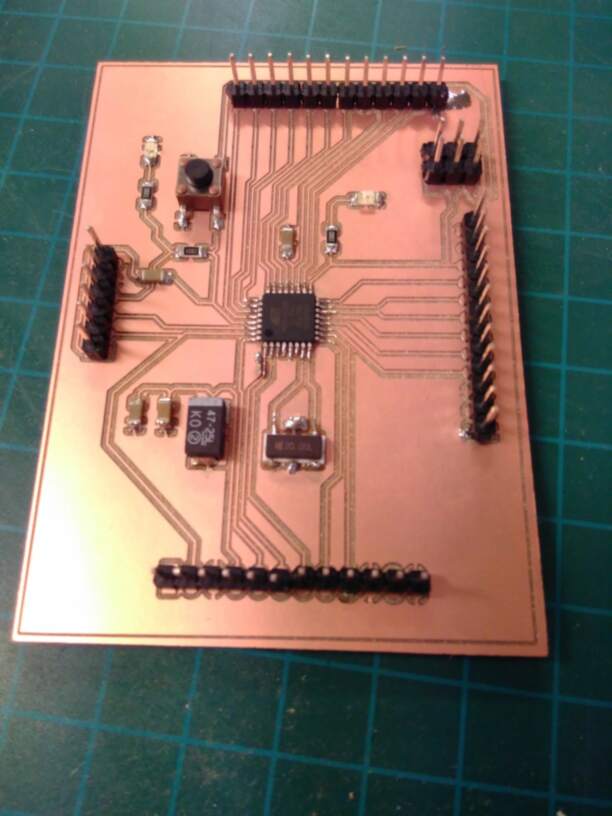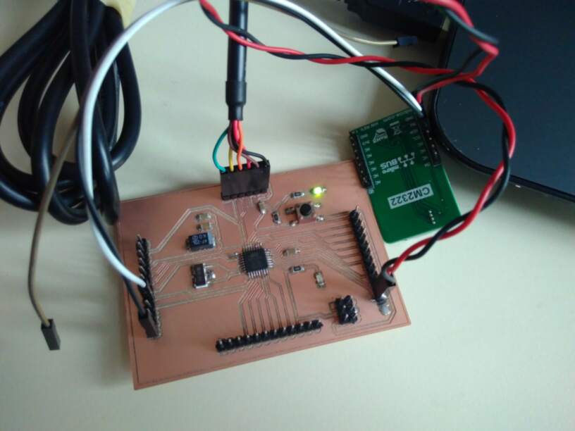 This week, I completed the design and fabrication of my mainboard, including a ATmega328P with a 2OMHz resonator and fanout of all the pins to pinheaders, on which I could connect external PCB’s (shields) for input or output devices, supply boards, etc… This week, I connect it to a DHT222 click from Mikroelektronika, to get the ambient temperature and humidity.