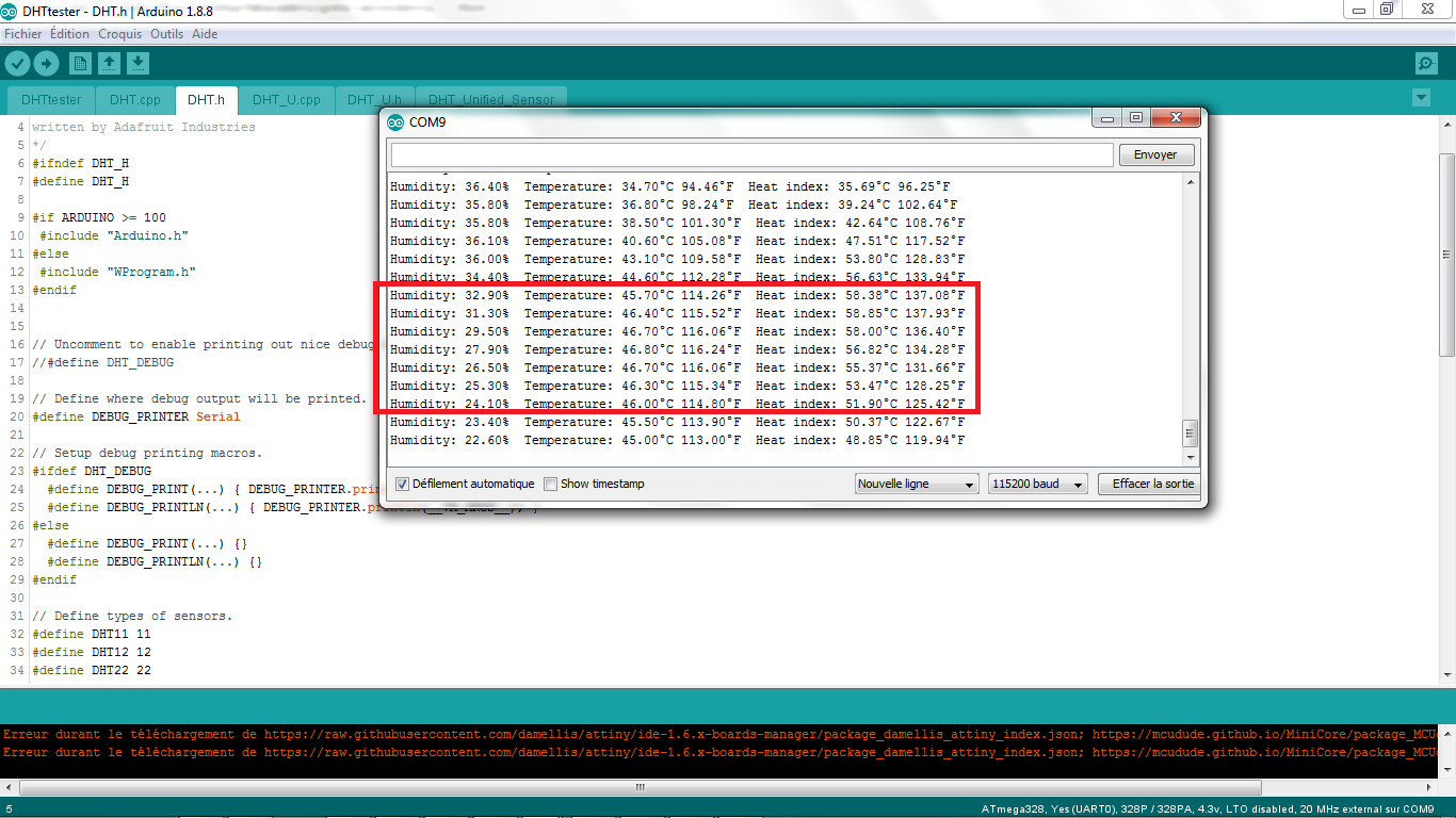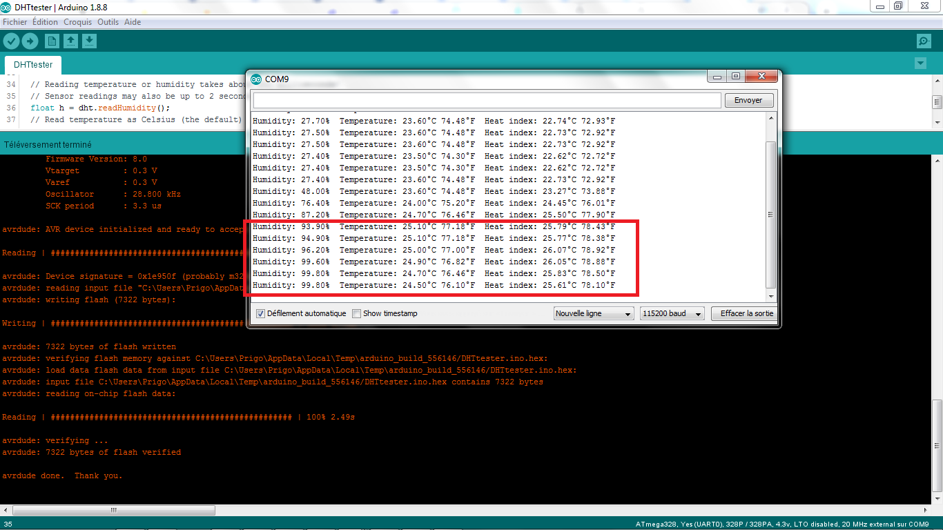 On the software level, I use in first instance the Arduino IDE and the sketch DHTTester, with sensor connected pin 9 on the microcontroller. Through the FTDI connector, the Serial monitor embedded in the Arduino IDE is available to display the data.