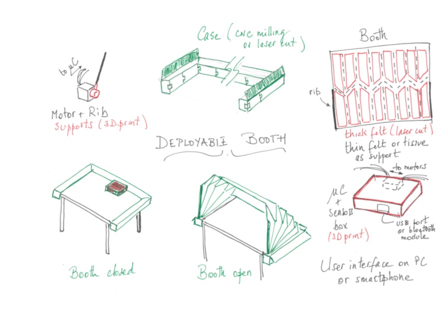 Everything will be ‘homemade’: * Electronics parts will include microcontroller, sensors (temperature, humidity, …), actuators (motor control) and user interface through serial or bluetooth communication * 3D printing will be used to make the different supports and electronic packaging * Laser cutting will be used to make the felt origami booth * CNC milling will be used to make the case of the booth
