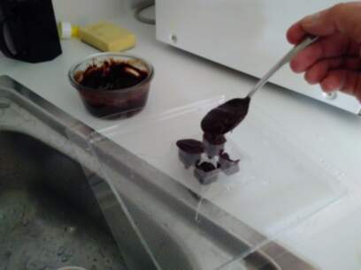 melting chocolate with some water in the microwave, and pouring the chocolate in the mold,