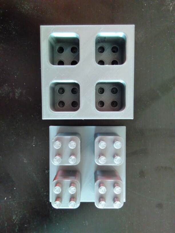 - Mold 1: A flat surface is added below the four cubes to hold them together.
