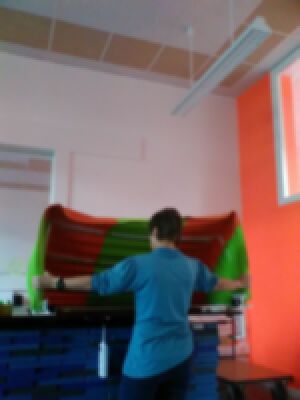 Sewing wire is used to attach the felt structure to the motor, through a screw hook on the top of the supporting rod: one end of the wire is attached to the stiffening wood of the structure. The other end of the wire is wound around the motor shaft, with a counterweight: