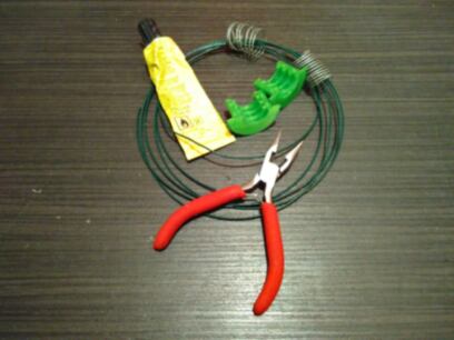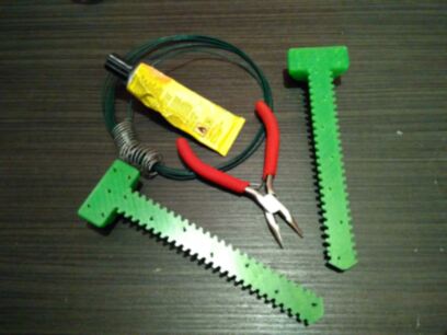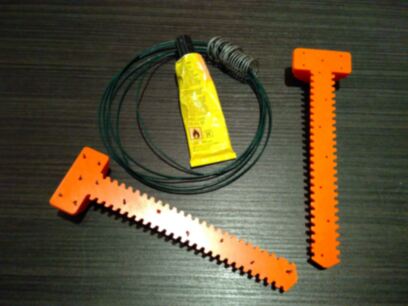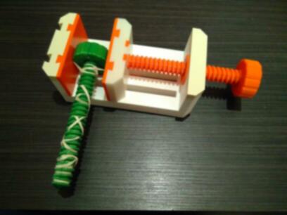 Assembling of both halfs of the screw nut and the bolt is done by gluing a small iron wire in the holes and fixing both pieces in a vice during the glue drying process.