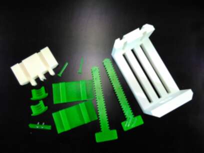 The several pieces are printed in PETG and the platforms (mobile and bottom) are printed in PLA.