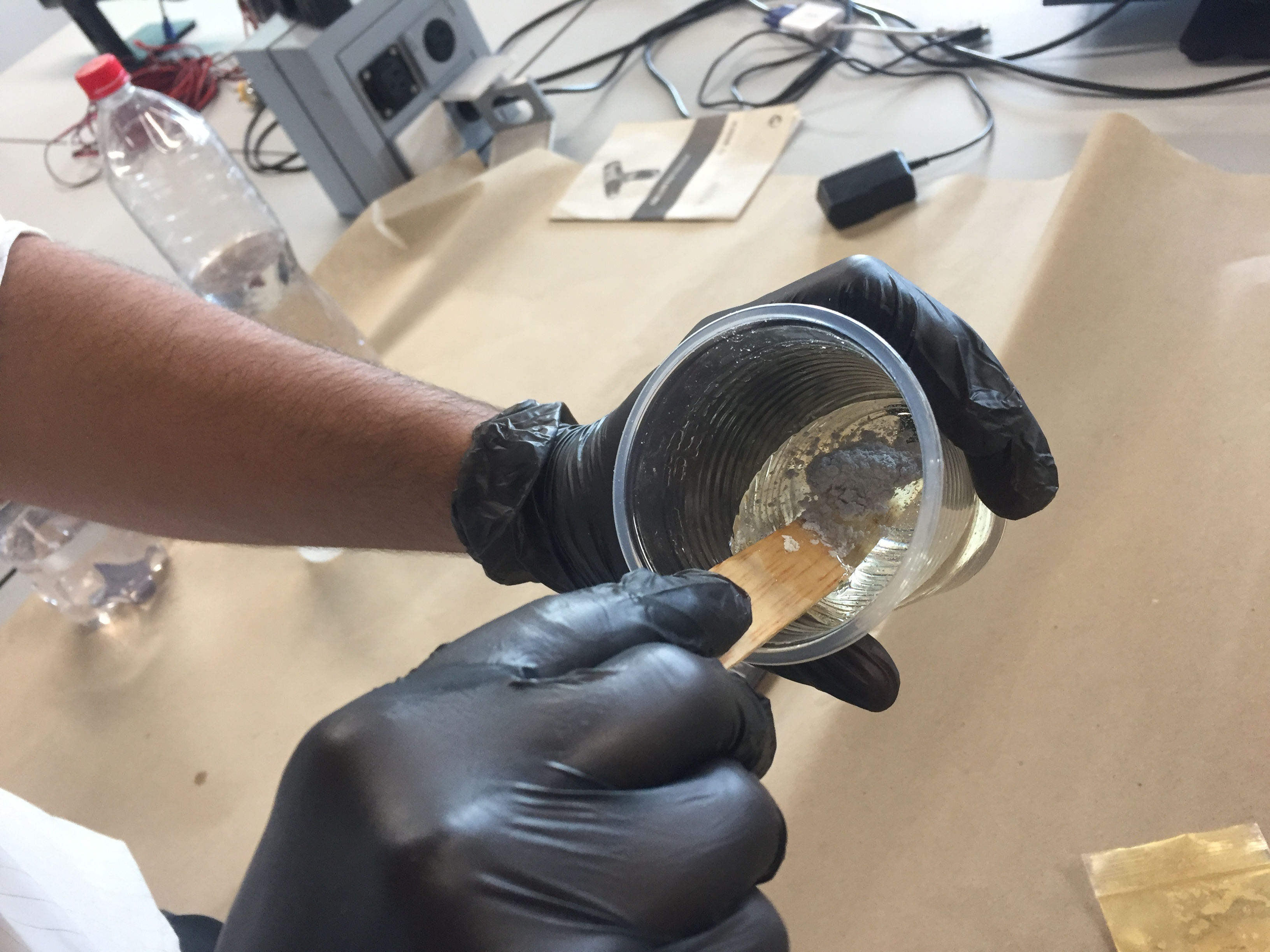 It is very important to mix very well part A (red) and B (blue) to be sure to have the good chemical reaction. In my case I used a wood stick.