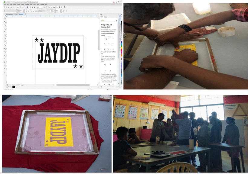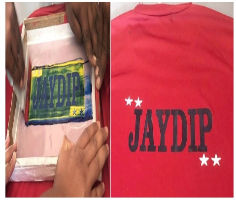 Group Assignment - Fabric PrintingThe Faculty has demonstrated the procedure of Fabric Printing to our Group. They have used Corel Draw and Plotted on the Vinyl Cutter. The Instructor pasted it on the palette block, which was a DIY frame with polyester cloth fitted in a wooden frame for printing it on the T shirt. He inserted a card board under the T shirt to avoid the paint sticking on the reverse side. Then he filled in Blue color for the name and white for the stars alternatively using a cello tape to block the colors. The trick lies in how best we use the pressure and fabric paint to get the print right. He also demonstrated using kerosene on how to clean off the color from the block. Though the design was visible, he said that the pores of the cloth must be clear to be reused again.