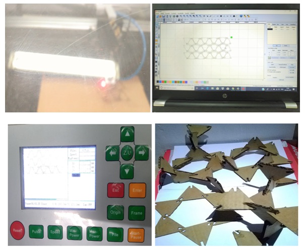 The object can be made in any software and has to be saved as .dxf file. Then import the file in RD works. RD works is machine software which controls the Speed and Power. We can also set different Power and Speed variables for different objects by using different colors. Given the Speed and Power for cutting and scanning, downloaded it. We have tried out 4 pieces first as demo and then tried cutting 4 pieces of cardboard as shown below.