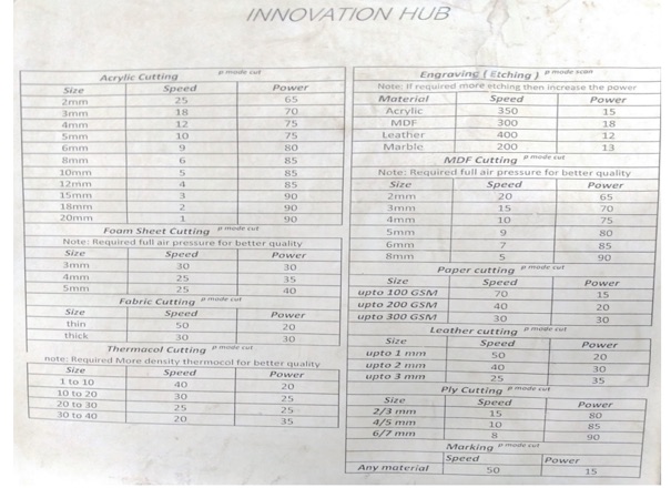 The Check List for different materials used for the Laser Cutting on the Machine.