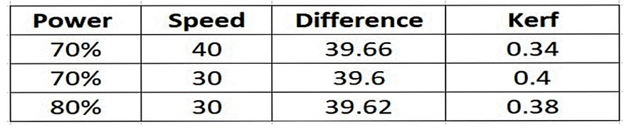 The best result we obtained was when the Speed - 40 and Power - 72, where the kerf achieved was 40mm width kerf was 0.4mm and 30mm height kerf was 0.29mm.