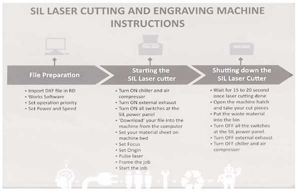 Our Fab Lab has two types of laser cutters, SIL laser cutter and epilog laser cutter. So, we have used SIL laser or CO2 laser cutter which is having a 600*900mm bed area and can cut materials up to 12mm. The software connected to it is RD Works. For importing any file this software we need to convert the file into (. dxf). The cutting, engraving and Scanning speed and power can be changed accordingly. Kerf is the portion burnt away by the material when it cuts through by the Laser on the Laser Cutting Machine. It is called as the Laser Kerf ranging in Millimeters.