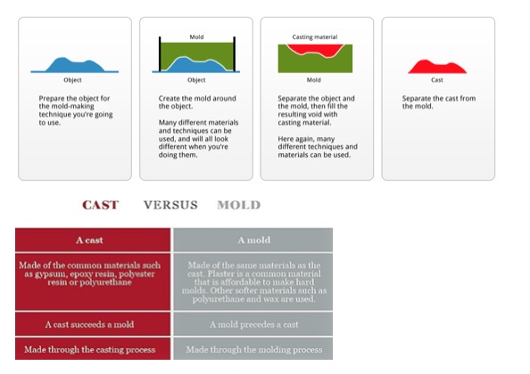 Now I got the clarity that Mold making is the process of creating a hollow, usually rigid vessel around an object. Once a mold is made around an object and when the object is removed, it leaves a hollow void in the mold, which is exactly similar to the size and shape of the said object. Casting is the process of filling this resulting hollow space in the mold with any preferred liquid or molten material to secure the desired object.