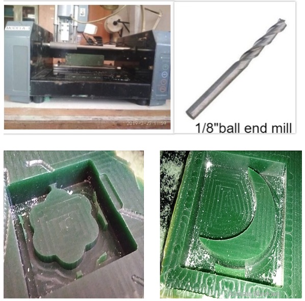I tried with the wax and wooden molds. I have used a 1/8”ball end mill on Modella.