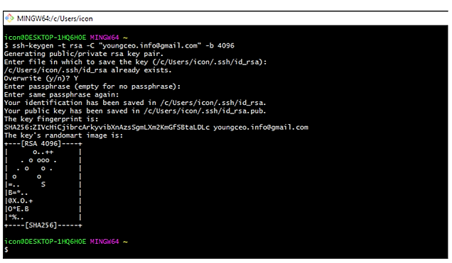 - ssh-keygen -t rsa -C "youngceo.info@gmail.com" -b 4096